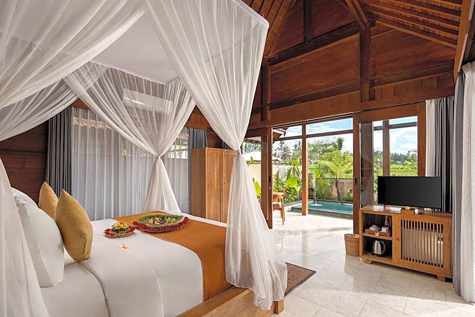 promises a stylish Bali escape in Banjar Tegallalang, featuring a private pool and a sparkling outdoor pool with garden views. Guests can soak up the scenery from terraces and balconies, then unwind in the hot tub after a day of exploration. Practical touches like free WiFi, air conditioning, and a private entrance keep stays comfortable and convenient.